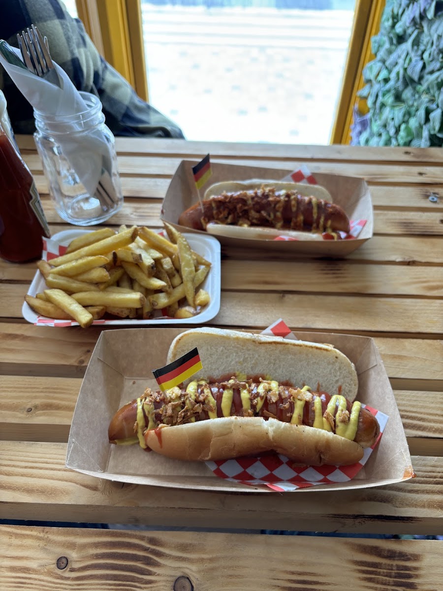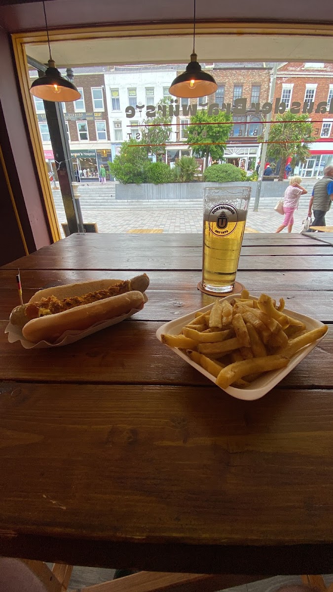 Delicious Bratwurst with all the trimmings and properly crunchy fries - exactly like being back at a snack stand in Germany! Good selection of beers (bottles and on tap) and cold drinks. It'll be fantastic in summer when the doors are open and people can spill out into the market and onto the pavement - really chilled and relaxed atmosphere. Great addition to Darlington town centre!